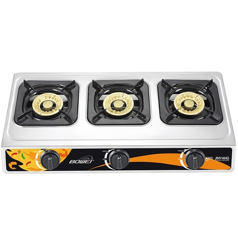 Utensilios de cocina para el hogar Cocina de gas de llama azul de acero inoxidable Encendido automático Estufa de gas de tres quemadores LPG